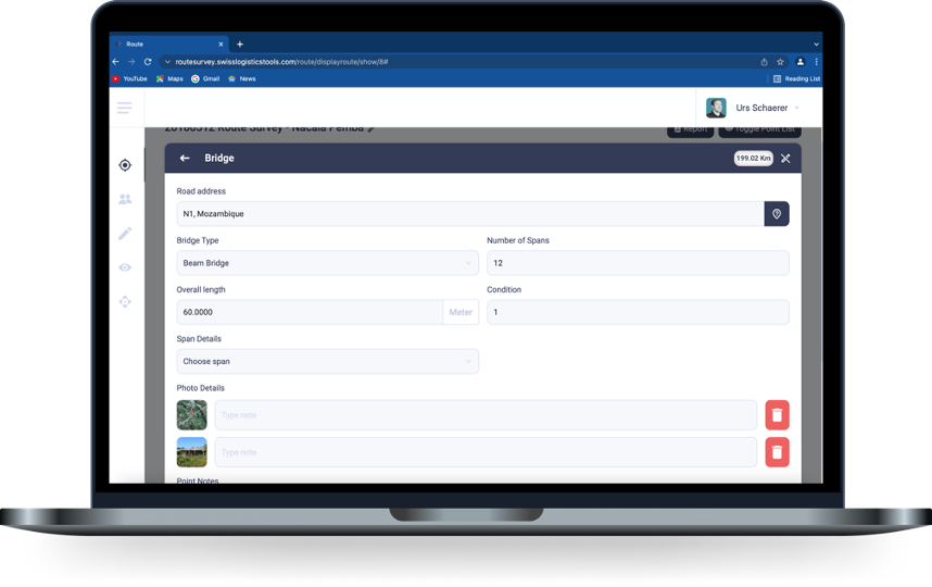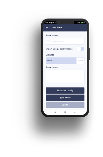 To save the route survey you can press the stop putton on the selection screen. The app will automatically upload the data to the cloud which can be accessed from the Web. Provide a route name and choose if you like to inclued Google Earth images from each of the survey points. Additional you can add some notes to the route survey.